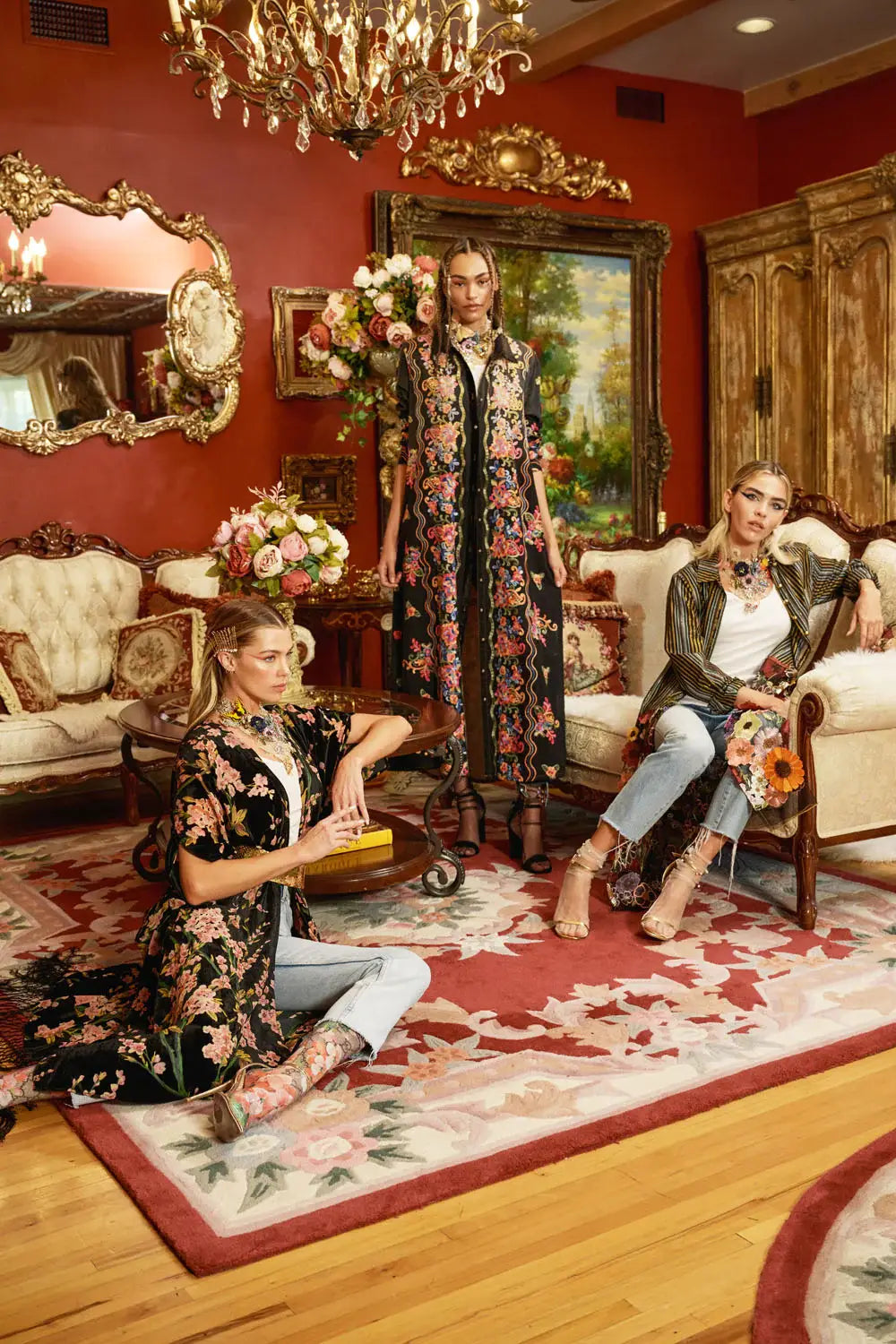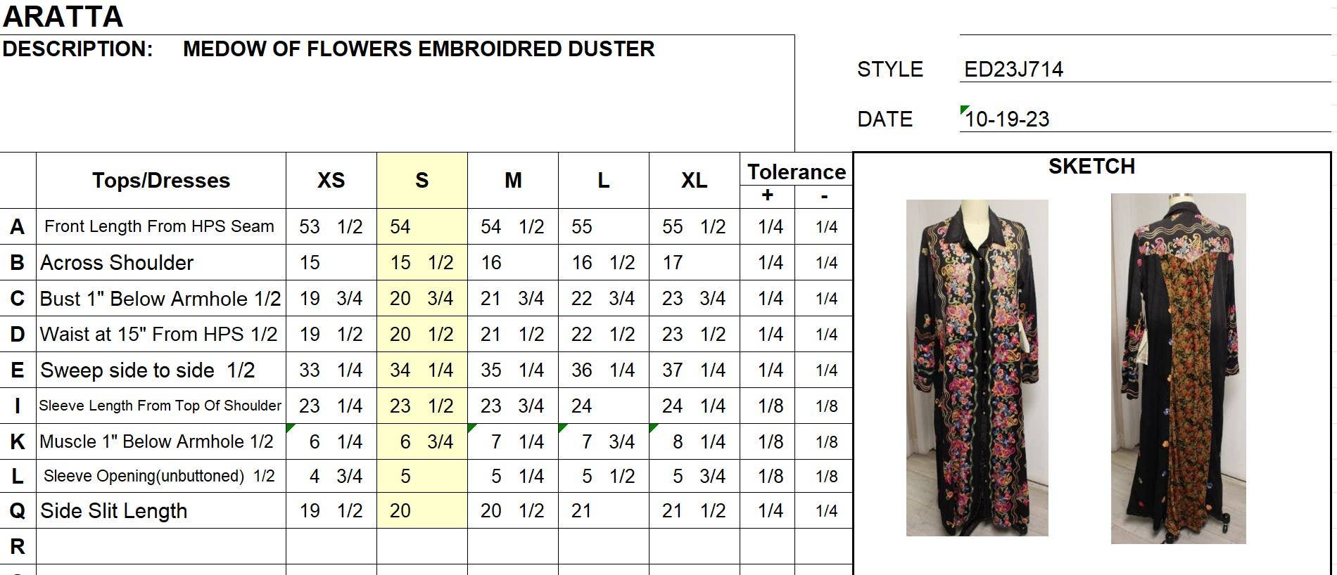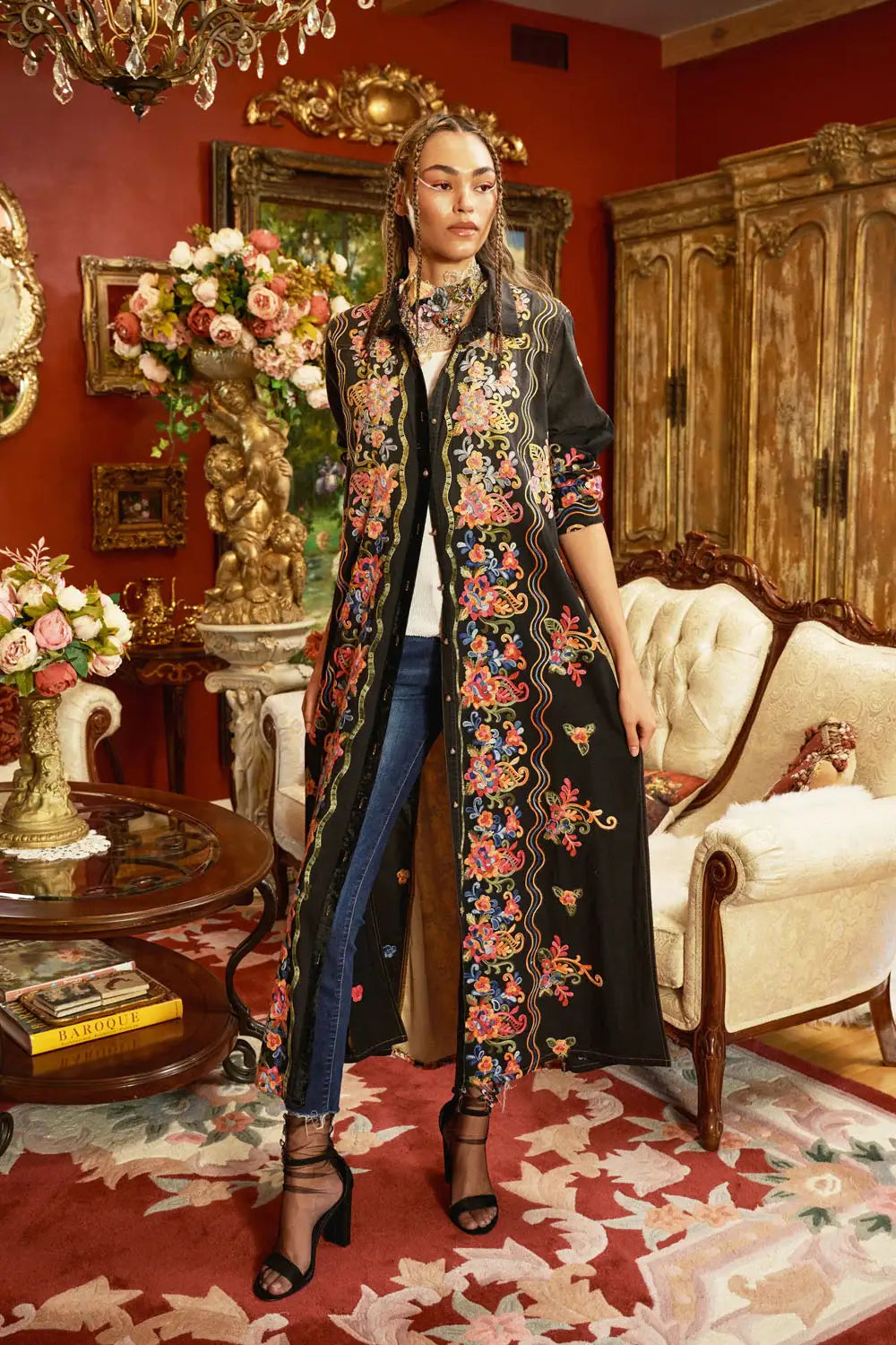 Embroidered button-up duster with floral print velvet CB panel, velvet CF placket, 2 side pockets, side slits.